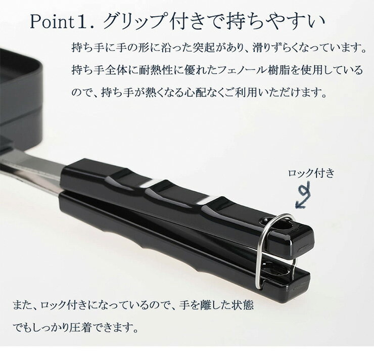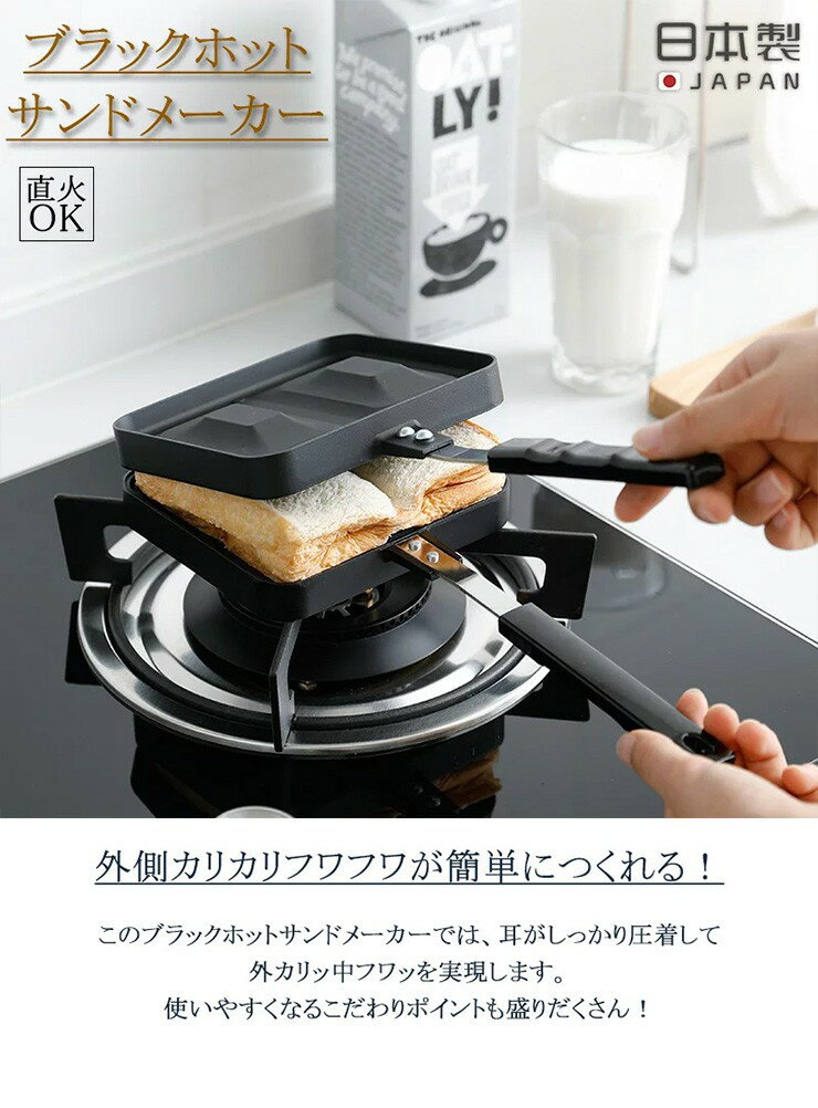 【商品名】ブラックホットサンドメーカー【サイズ】全長35.5×奥行14×高さ4cm焼き面13.3×11.7cm【材質】アルミダイキャスト[取っ手]フェノール樹脂【原産地】日本【商品詳細】外側カリカリ中フワフワが簡単に作れる!耳がしっかり圧着して外カリッ中フワッを実現します。