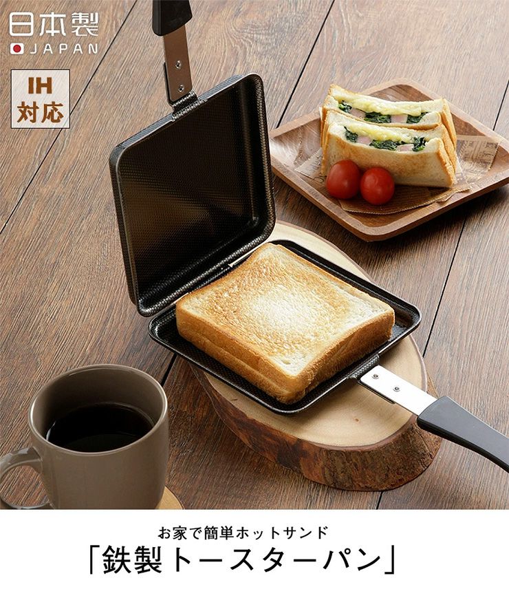 【商品名】鉄製トースターパン【サイズ】(約)幅36.5×奥行15.5×高さ3.3cm 内寸:14×14×深さ(上皿)1.7cm(下皿)1.5cm【重量】(約)880g【材質】本体:鉄(両面エンボス加工1.6mm厚、透明シリコン樹脂塗装)ハンドル金具:鉄(クロムメッキ、2.0mm厚)、ハンドル:フェノール樹脂(耐熱140℃)、ハンドルフック:18-8ステンレス(線径2.0mm)【原産地】日本【商品詳細】6枚切・8枚切の耳付き食パンが2枚重ねてスッポリ入る大きめサイズです。