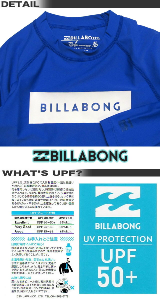 インターナショナルサーフブランド”BILLABONGビラボン”の 大人と同じ、超ストレッチ素材を使ったキッズのラッシュガードで UVカットは最高のUPF50+ ※90サイズのみ後ろ襟にスナップボタンあり。