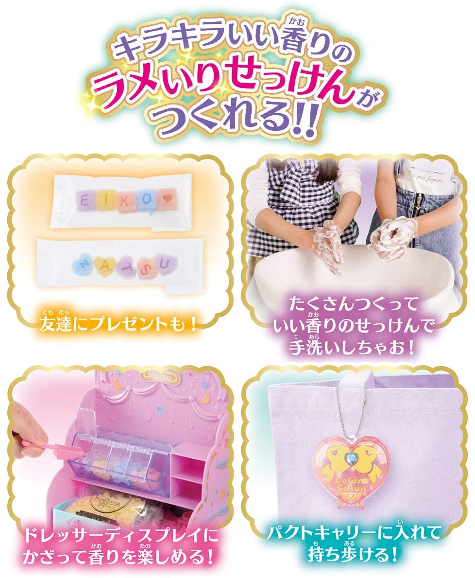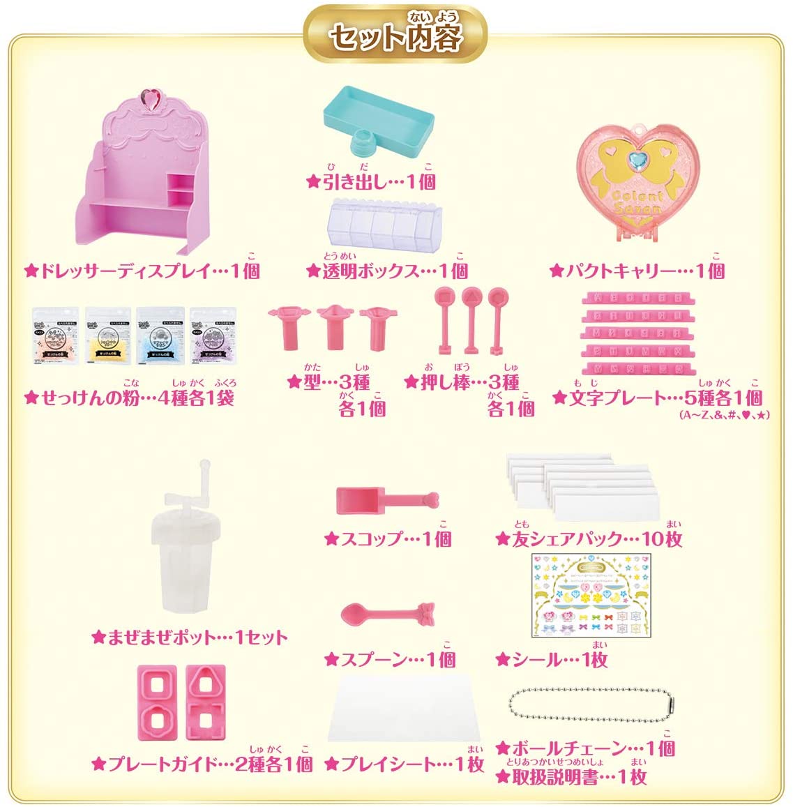 【セット内容】ドレッサーディスプレイ1、引き出し1、透明ボックス1、パクトキャリー1、せっけんの粉4、型3、文字プレート5、プレートガイド2、スコップ1、スプーン1、まぜまぜポット1、友シェアバック10、シール1、プレイシート1、ボールチェーン1、取扱説明書1