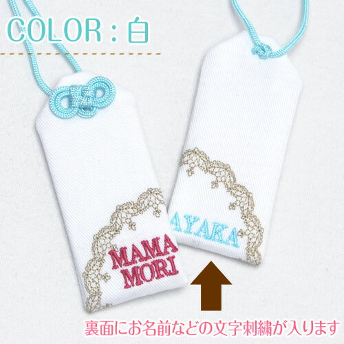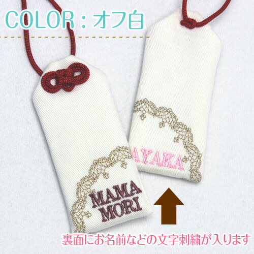サイズ 【ロングサイズ】縦8cm 横3.5cm ひも15cm 生地素材 綿100% 表面 レースモチーフ+『MAMAMORI』 裏面 レースモチーフ+お名前等、ご希望の文字を刺繍でお入れします。