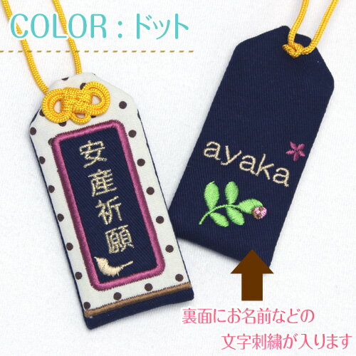 サイズ 【ロングサイズ】縦8cm 横3.5cm ひも15cm 生地素材 綿100% 表面 コトリ+『安産祈願』 裏面 葉っぱ、てんとうむし、お花イラスト+お名前等、ご希望の文字を刺繍でお入れします。
